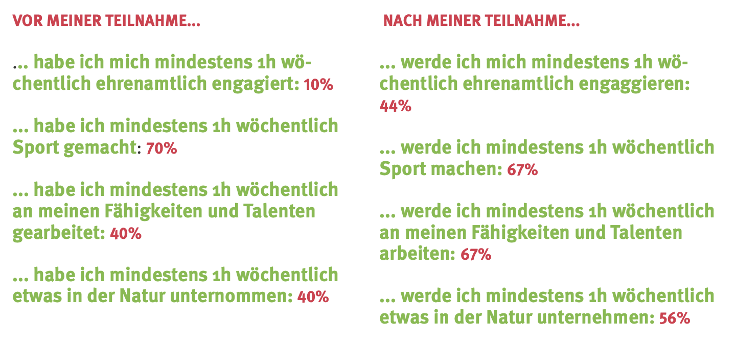 The acquisition of these skills, the changed perspectives (‘I can do more than I thought’) and the new attitudes (‘I can achieve a lot of things that are important to me if I just set my mind to it’) lead to changes in behaviour: Participants are increasingly active in sports, they acquire and strengthen new skills on their own responsibility and/or devote themselves to newly discovered passions (national figures from 2023):